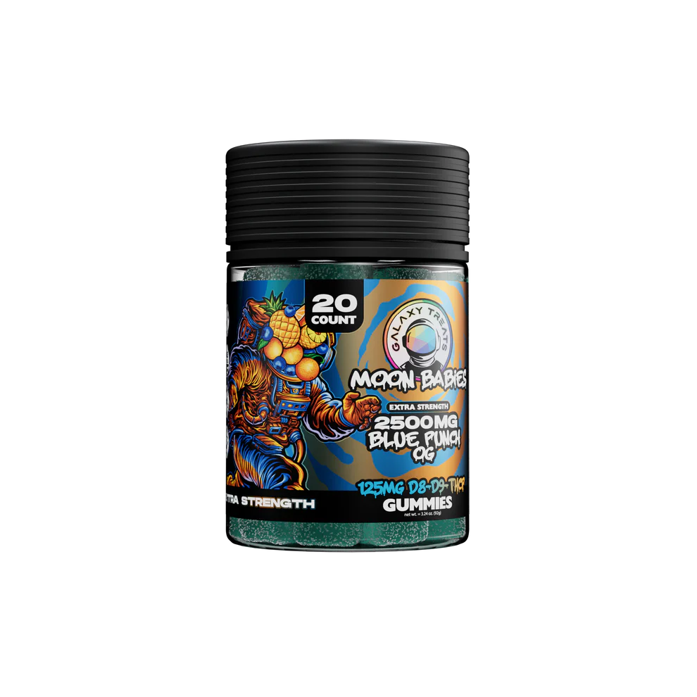 Moon Babies Blue Punch D8 D9 THCP Extra Strength Gummies are high-potency hemp-derived edibles infused with a powerful blend of Delta 8, Delta 9, and THCP. Bursting with bold blue punch flavor, these gummies deliver smooth relaxation, uplifting euphoria, and long-lasting effects in every bite. Crafted for consistency and third-party tested for quality, they offer a convenient and discreet way to elevate your experience anytime.